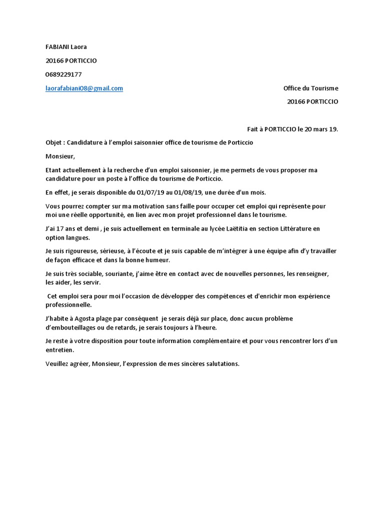 Lettre De Motivation Demande De Stage En Office De Tourisme Fiche Anaichtiti