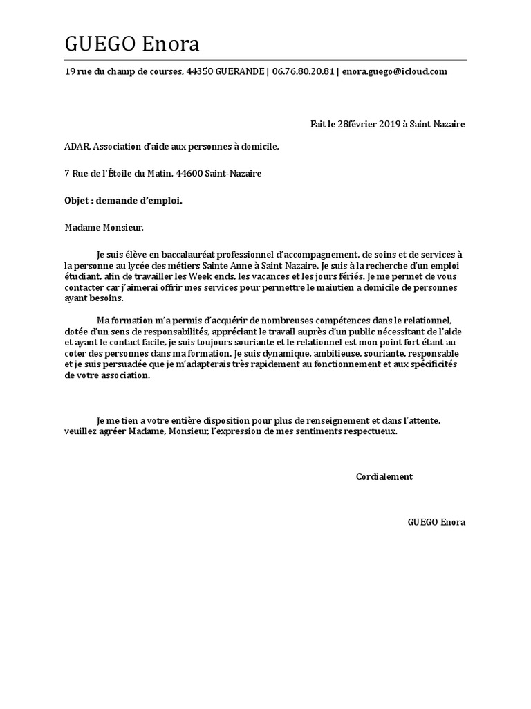 NOM PRENOM ADRESSE TELEPHONE MAIL A lattention de. Ce modèle de lettre de motivation sadresse à ceux qui veulent postuler spontanément ou suite à une annonce à un poste daide à domicile. Now this can be the first impression.