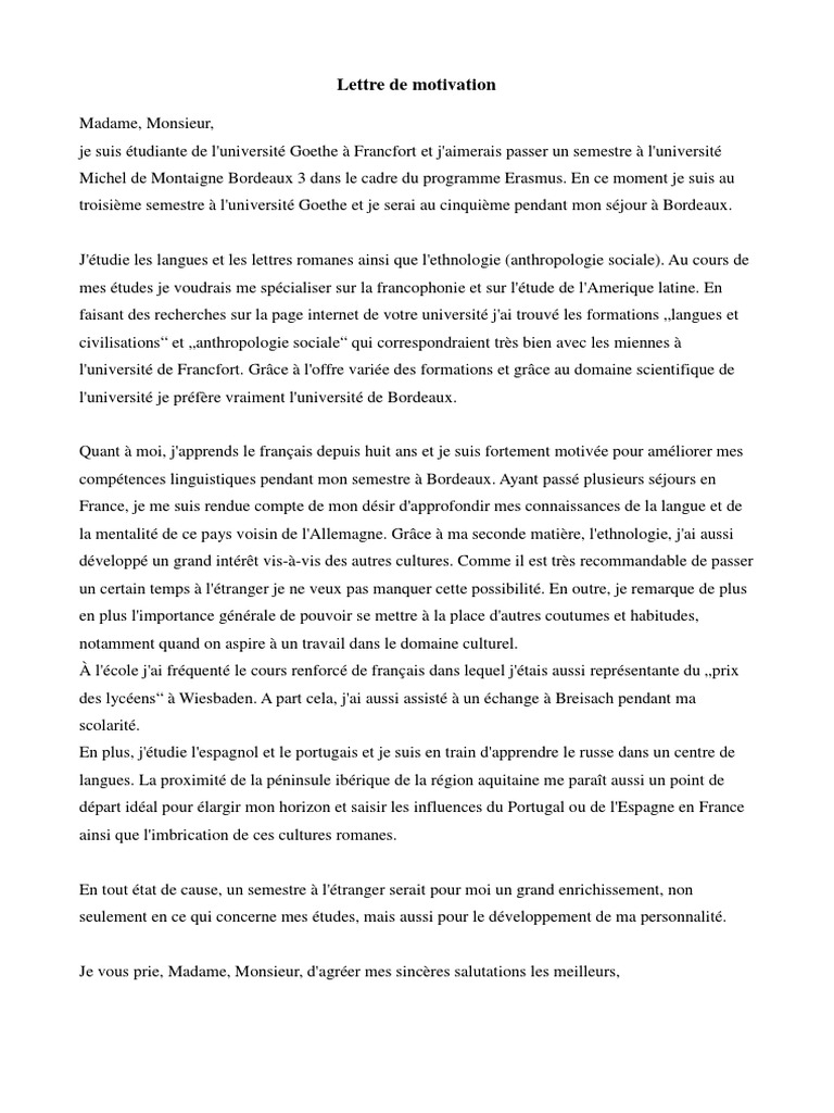 Lettre De Motivation En Francais Exemple Langue Francaise Universite